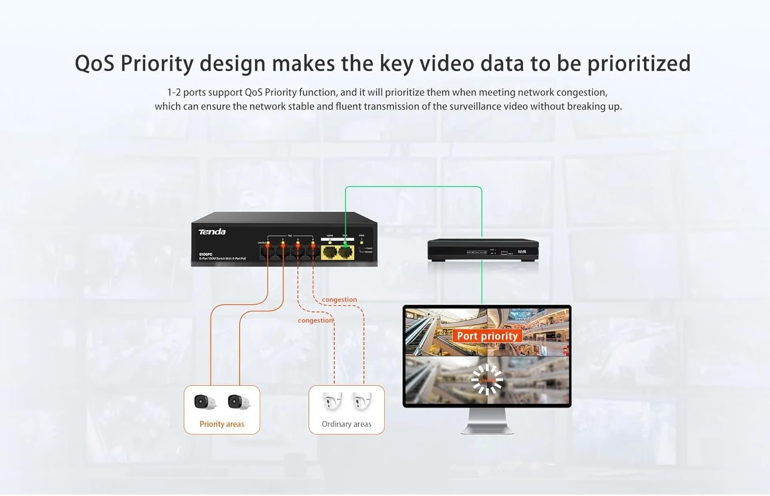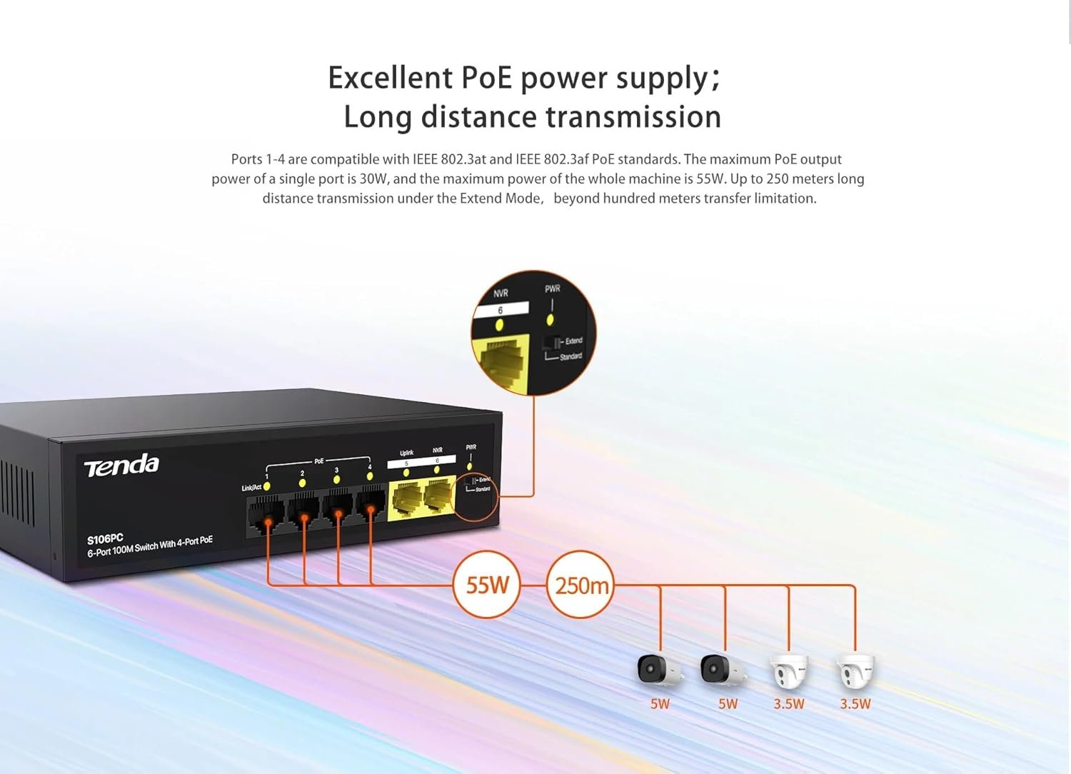 The Tenda S106PC is a 6-port 100M Lite PoE switch purpose-built for small-scale video surveillance networks and business connectivity needs. Independently designed by Tenda, this unmanaged switch features 4 Power over Ethernet ports and 2 uplink ports, delivering reliable power and data transmission for IP cameras, wireless access points, and other network devices. With a total PoE budget of 55W and support for IEEE 802.3af/at standards, the S106PC provides up to 30W per port โ sufficient for powering PTZ cameras, outdoor access points, and high-power devices. The extended mode feature allows PoE transmission distances up to 250 metres, making it ideal for large properties, warehouses, and perimeter surveillance applications. Its compact metal housing, plug-and-play design, and advanced features like one-key VLAN and QoS priority make it the perfect backbone for small enterprise, convenience store, and restaurant video surveillance networks.