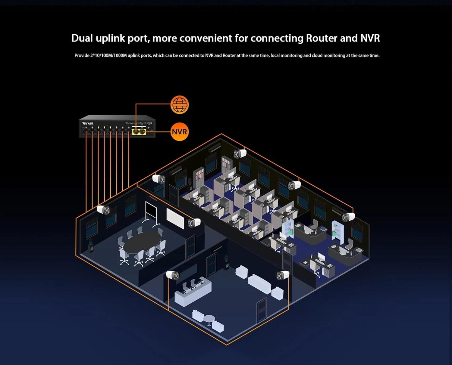 - 10-Port Configuration with 8 PoE+ Ports: Features 8 Fast Ethernet PoE ports (10/100Mbps) delivering data and power over single cable, plus 2 gigabit uplink ports (10/100/1000Mbps) for NVR/router connectivity โ ideal for surveillance systems